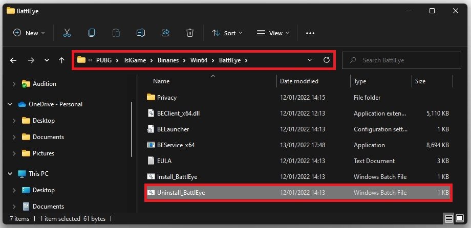 重新安裝戰眼申請PUBG。打開你的文件瀏覽器並導航到您保存的驅動器蒸汽遊戲開始。導航至:程序文件>蒸汽>蒸汽應用程序>常見的>絕地求生>TSL遊戲>二進製文件>作業系統>戰眼。按兩下卸載_BattleEye批處理文件並繼續卸載。按兩下安裝BattleEye文件來重新安裝它。