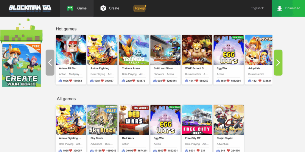 另一個吸引人的 Roblox 替代品是 Blockman Go。它將各種迷你游戲與廣泛的頭像自定義選項結合在塊式世界中,讓人想起 Roblox 和 Minecraft。雖然主要以其移動應用程序而聞名,但瀏覽器版本可以通過 now.gg(強化方法 1 的實用性)等平台訪問,從而可以在學校計算機上獲得類似的體驗。