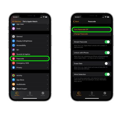 3. 關閉 Apple Watch 密碼,然後再次打開