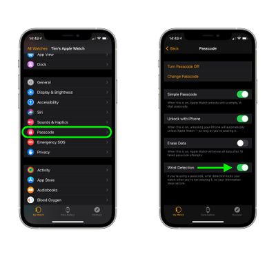 Apple Watch 使用手腕檢測來了解您是否佩戴了它,如果沒有佩戴,則需要您輸入密碼才能訪問。必須啟用手腕檢測才能使用 Apple Watch 進行解鎖。所以進入手錶您的 iPhone 上的應用程序,以及手錶選項卡,選擇密碼並確保手腕檢測開關處於綠色 ON 位置。