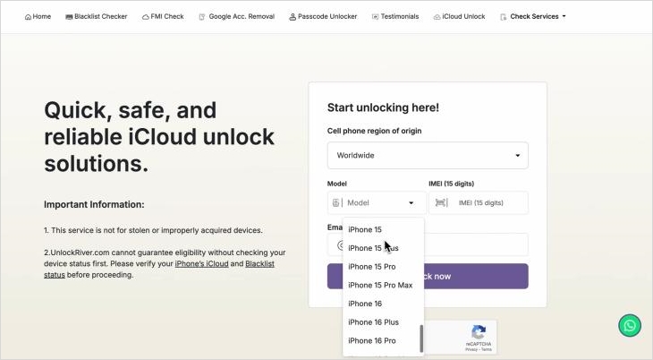 了解 UnlockRiver 後,如果您還想嘗試一下,可以在上面找到並輸入您的 IMEI 號碼和電子郵件地址官方網站執行黑名單檢查、FMI 檢查、運營商解鎖或刪除 Google 帳戶。對於完整的 iCloud 解鎖過程,請按照下面的使用指南進行操作。
