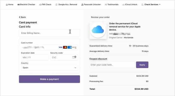 步驟2。接下來,您將被引導至付款頁面。在這裡,您需要確認解鎖費用並輸入您的付款詳細信息。