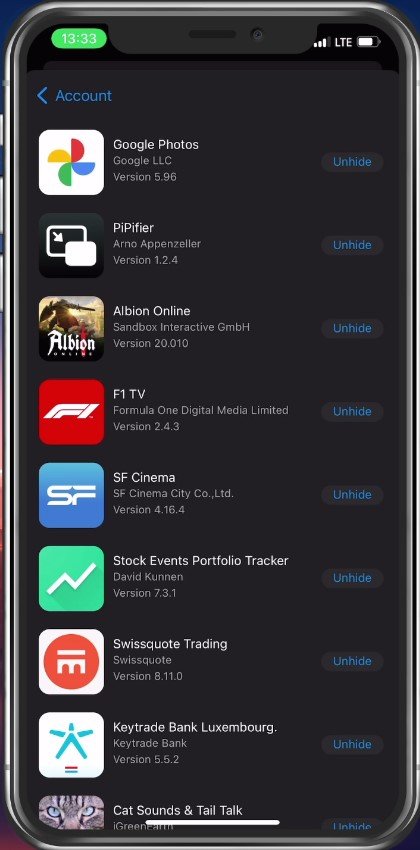 這將顯示您的帳戶過去隱藏的應用程序和其他購買項目的列表。如果您願意,可以繼續取消隱藏這些購買。