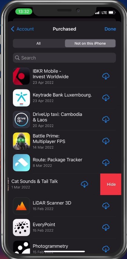 您將看到 App Store 中所有免費和付費下載的列表。在不適用於這款 iPhone選項卡中,您可以預覽設備上未安裝的所有應用程序。當向右滑動這些應用程序之一時,您可以繼續隱藏此購買列表中的應用程序。這將確保這些應用程序將從您的購買歷史記錄中刪除。