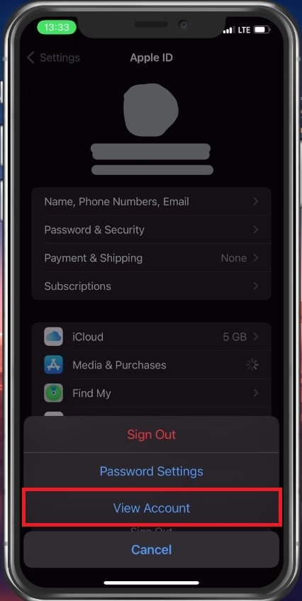 如果您覺得應用程序已被其他用戶隱藏,那麼有一種方法可以找到隱藏在您的購買歷史記錄中的應用程序的完整列表。在 iPhone 設置中,點按蘋果ID姓名。在這裡,點擊媒體與購買進而查看賬戶。