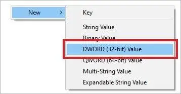 第7步:右鍵單擊右側並選擇新建>DWORD(32 位)值。