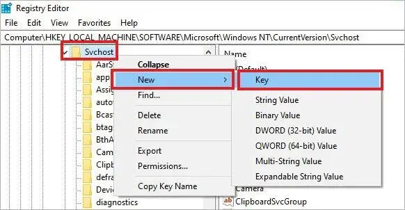步驟 4:右鍵單擊 Svchost 條目並選擇新建 > 密鑰。