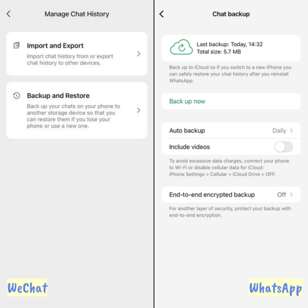 微信和WhatsApp都支持數據備份,您可以直接在應用程序中設置備份。