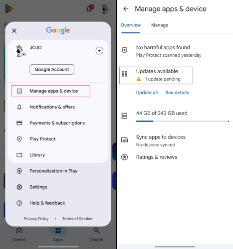 步驟2。輕敲管理應用和設備 > 可用更新查看 WhatsApp 是否正在等待更新。