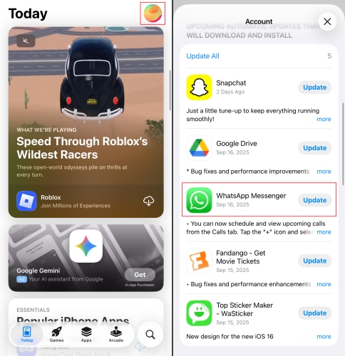 步驟2。滾動查看 WhatsApp 是否在更新列表中。點擊更新(如果有)。
