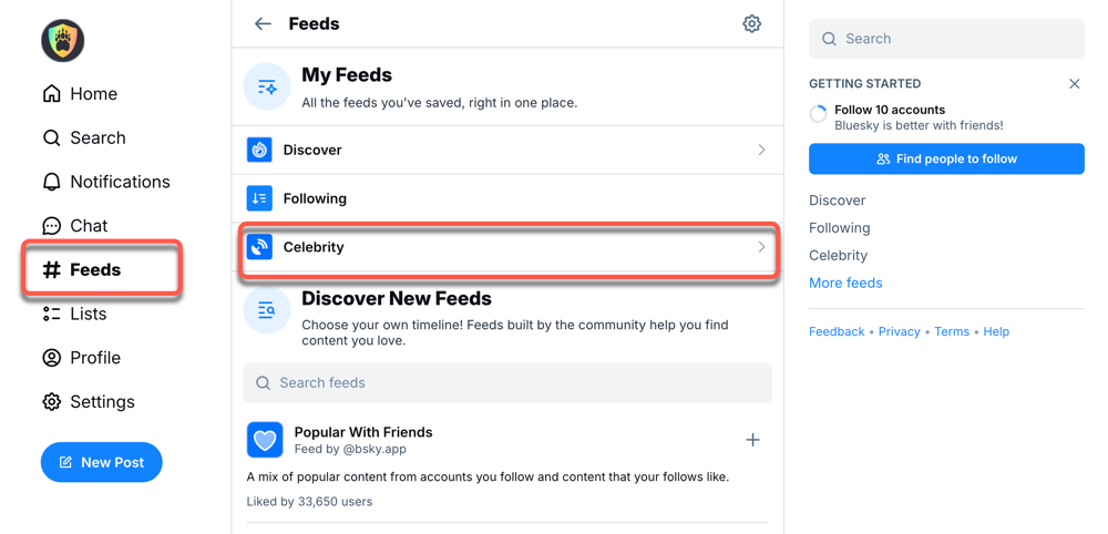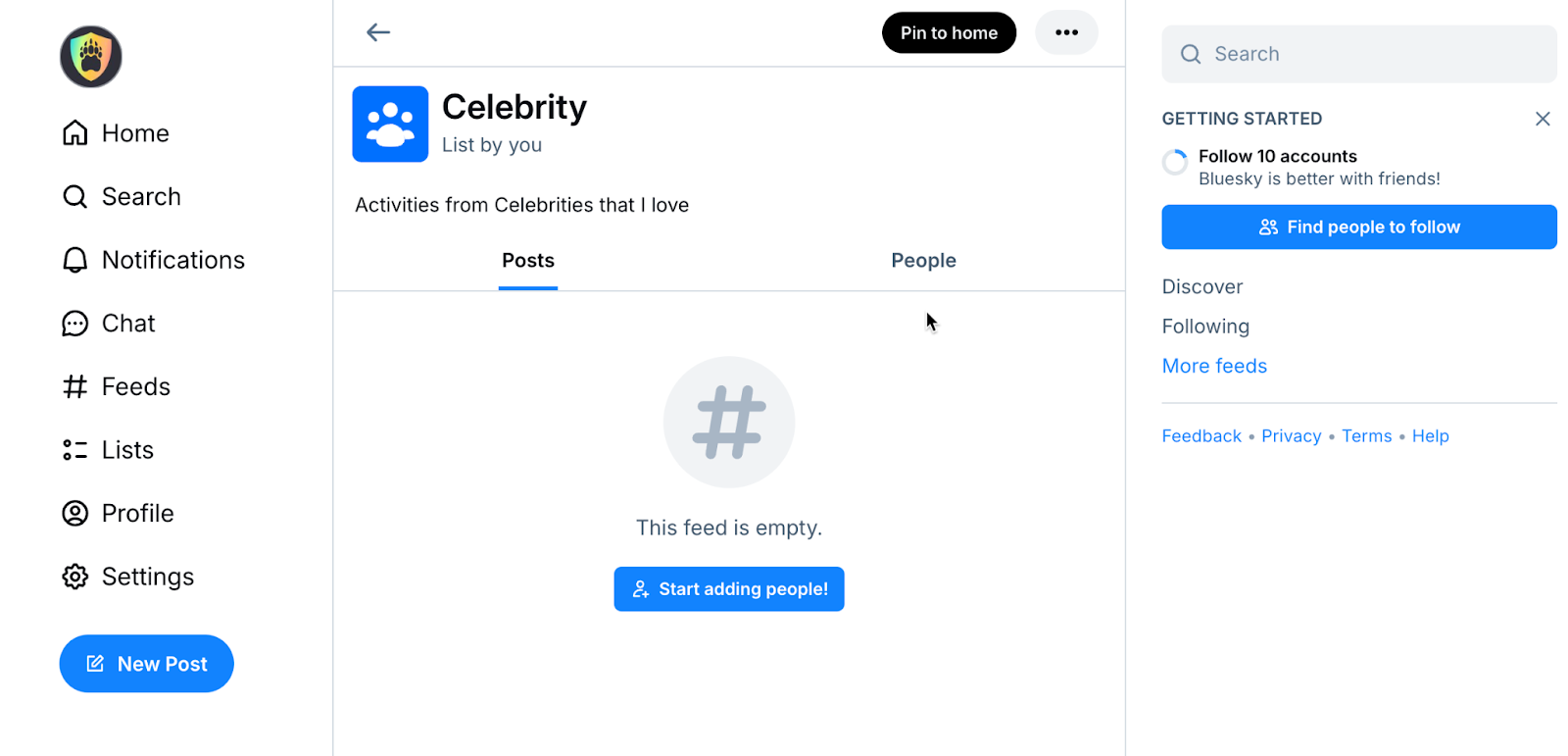 4. 單擊固定到主頁這樣,當您在左側欄中選擇#Feeds 時,您就會看到您保存為 Bluesky feed 的人。無論您是否關注此人,這都有效。