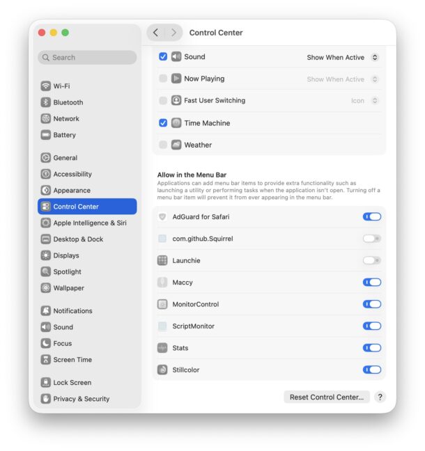 奇怪的是,您甚至可能會在控制中心設置的菜單欄部分看到 com.github.squirrel。為什麼它在那裡,誰知道呢,因為它似乎沒有菜單欄項目(或者可能有,但隱藏在 MacBook 上令人討厭的凹口下)。