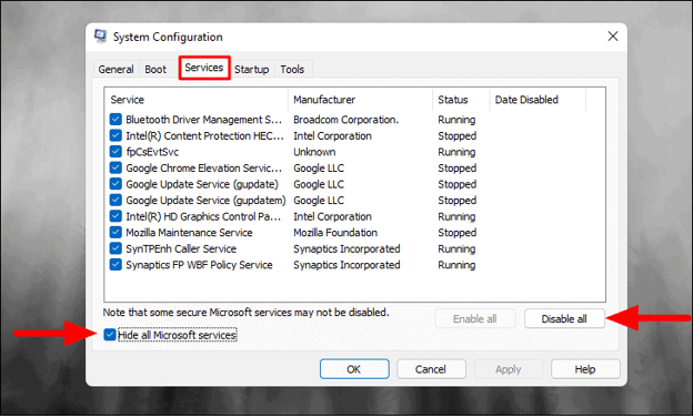 步驟 3. 選擇隱藏所有 Microsoft 服務旁邊的框,然後單擊全部禁用按鈕。