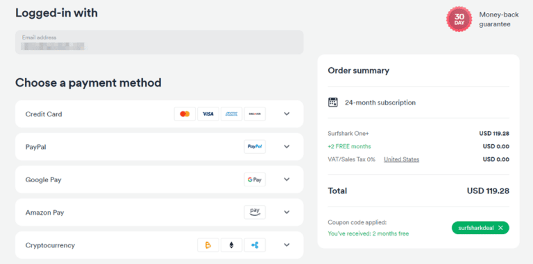 Surfshark 接受信用卡,貝寶,谷歌支付,和亞馬遜支付。