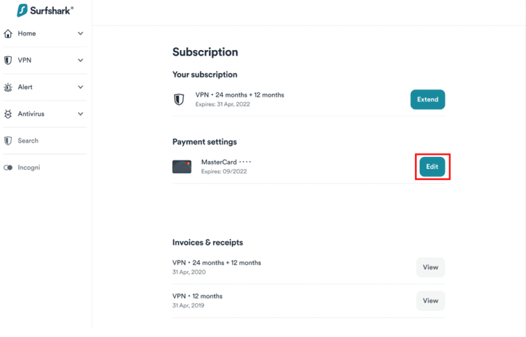 - 在“付款設置,“ 點擊 ”編輯”並更改您的 Surfshark 付款方式。