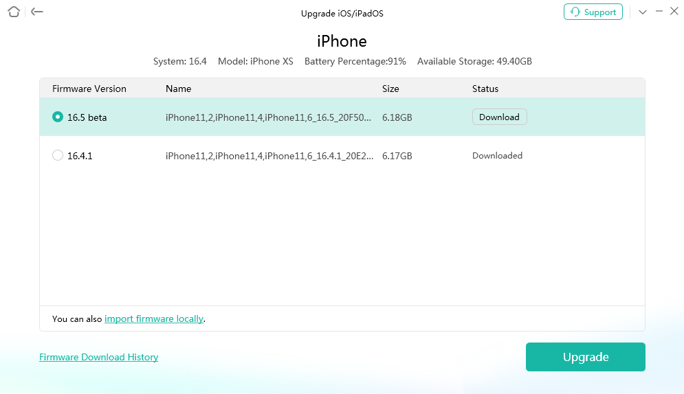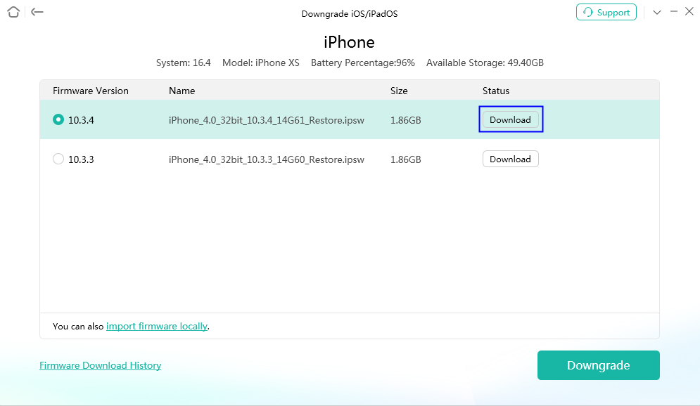 步驟3.它將顯示所有低於您手機軟件版本的固件包。點擊下載在您想要的 iOS 版本旁邊。