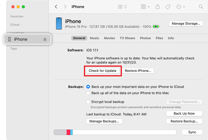 步驟 4. 打開 Finder。從右側面板中選擇您的 iPhone,然後單擊“檢查更新”。選擇您下載的 IPSW 配置文件並將其安裝到您的手機上。