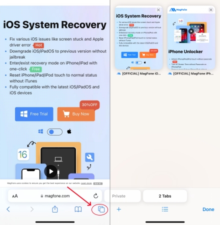 步驟1。在 iPhone 上啟動 Safari,然後點擊底部右上角的“所有選項卡”圖標。