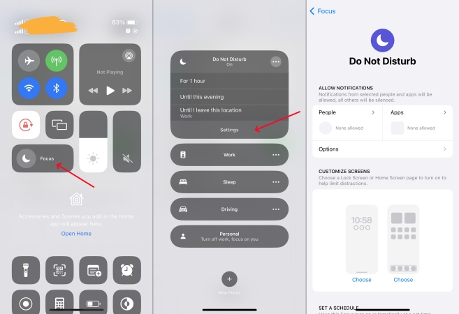 通過 iOS 15 或更高版本中的“焦點”設置,“請勿打擾”可以使來電、提醒和通知靜音。如果您不希望 iPhone 在接收通知時持續發出蜂鳴聲,您可以打開“請勿打擾”。當“請勿打擾”打開時,您的設備不會持續發出蜂鳴聲。