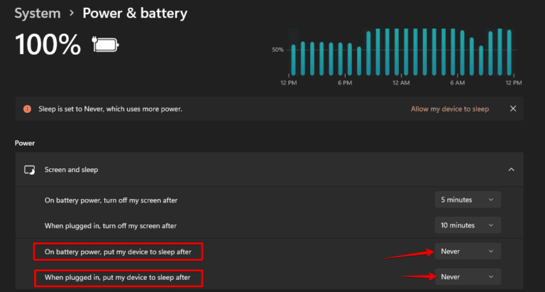 - 在列表中選擇“使用電池供電時,讓我的設備進入睡眠狀態,”並將計劃選項更改為“絕不”。