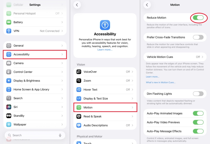 - 解決方案 2. 減少運動。在設置中,點擊輔助功能 > 運動 > 減少運動。然後切換減少運動在。