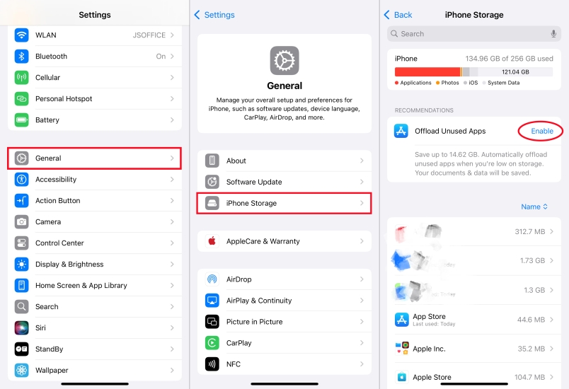 - 解決方案 2. 卸載大型應用程序。在設置中,點擊常規 > iPhone 存儲空間,然後點擊使能夠。然後自動卸載未使用的應用程序。