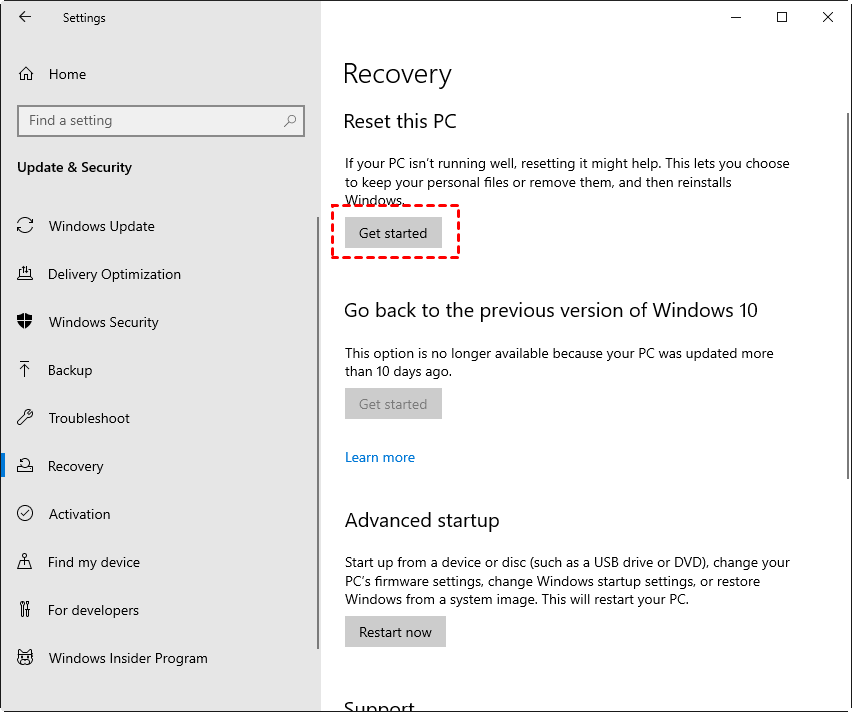 單擊開始菜單圖標並選擇電腦設置。裡面,挑更新與安全,然後選擇左側的恢復。單擊開始使用按鈕位於右側。最後,按照屏幕上的說明完成該過程。
