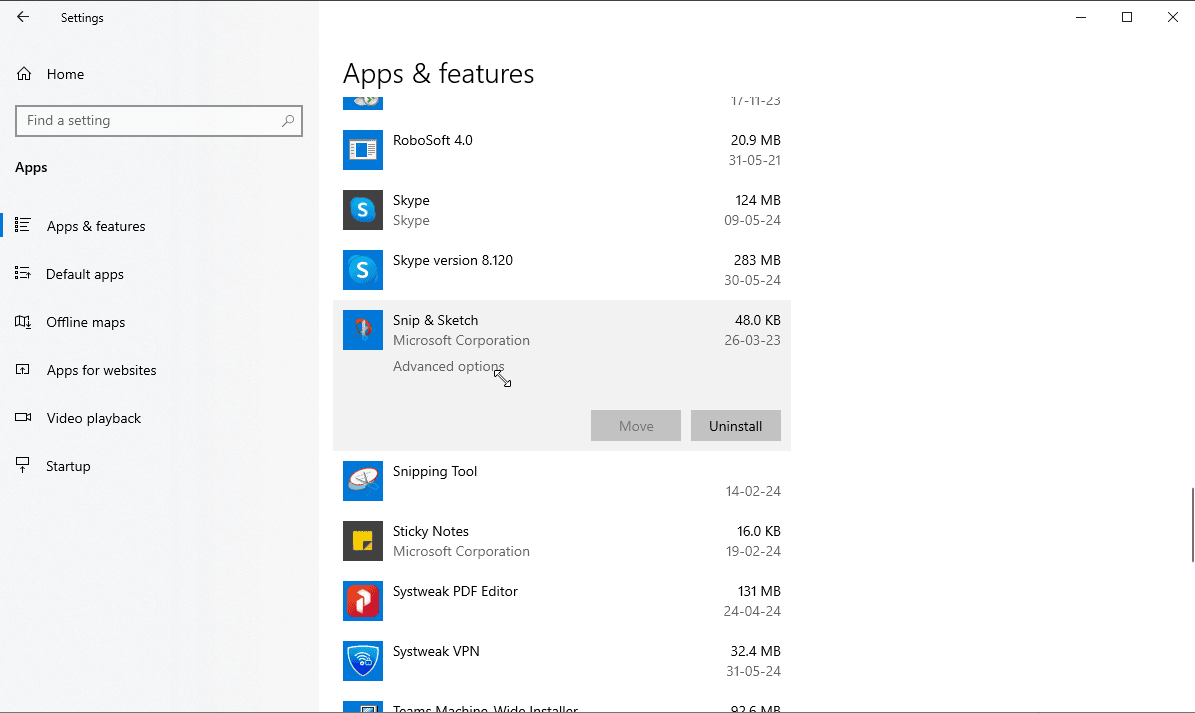 - 在右窗格下應用程序和功能, 尋找截圖和素描。單擊它並選擇高級選項。