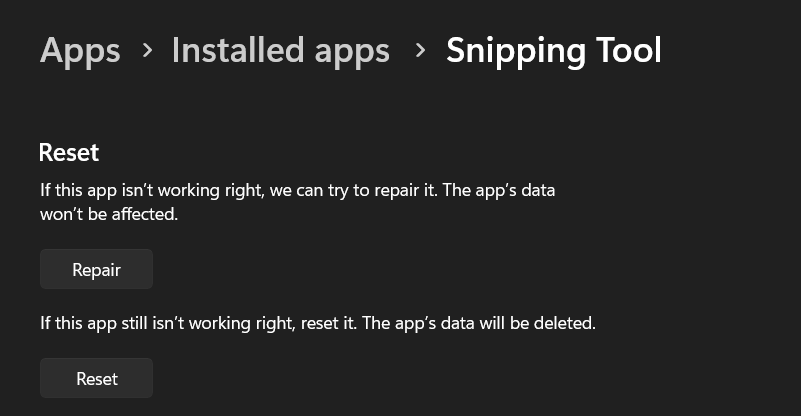 通常,共享的修復程序會對您有所幫助,但這些只能修復錯誤,並不能保證它不會返回。這就是為什麼切換應用程序更有意義。嘗試這些修復,Win+Shift+S 即可再次工作。